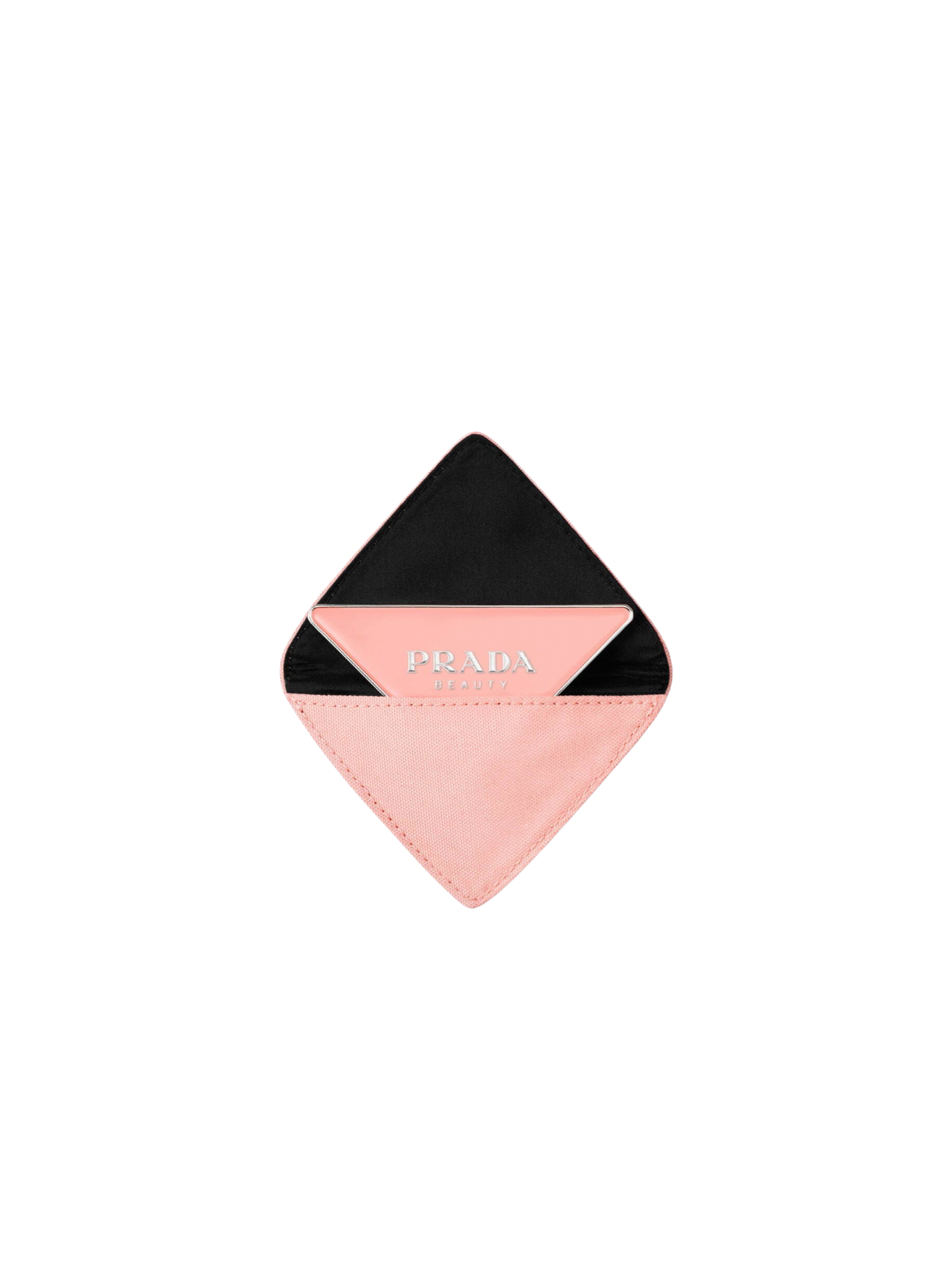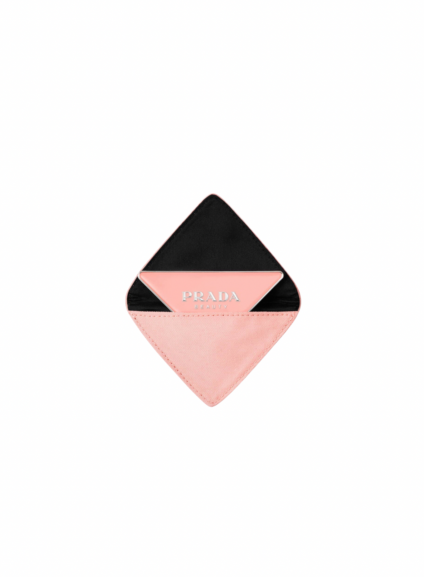 ელეგანტური და თანამედროვე კომპაქტური სარკე PRADA-სგან — წარმოდგენილია ვარდისფერი დიზაინით და ბრენდის ლოგოთი.